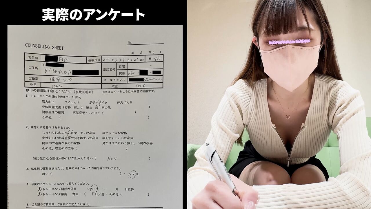 カウンセリングシートに記入中も、ファスナーから莉乃さんの巨乳がチラリと見えていて