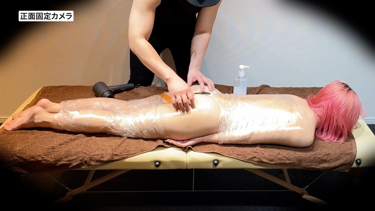 全身にクリームの塗布が完了し、続いて杏奈さんの体をラッピングして